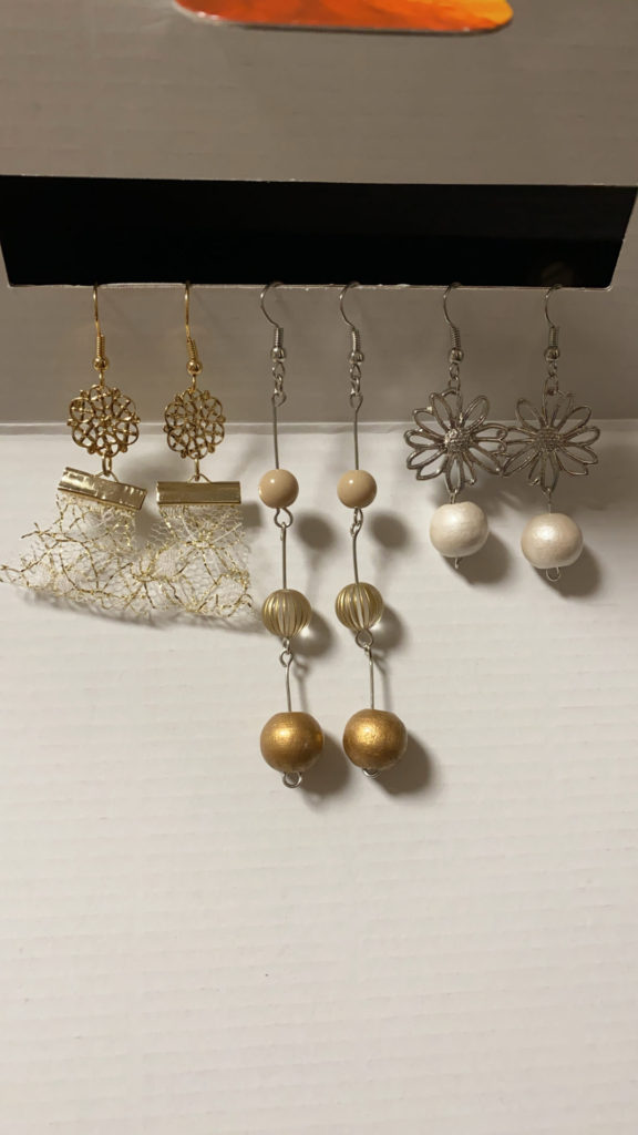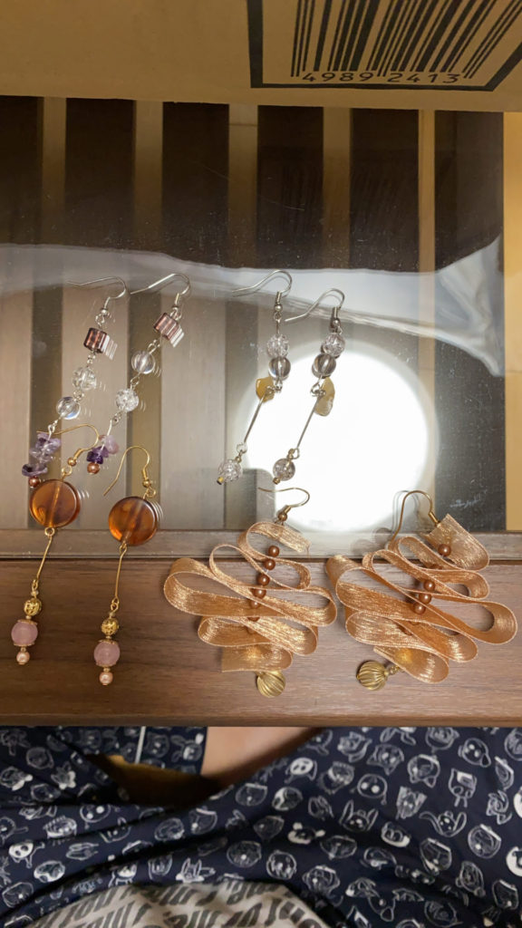 私はピアス集めが趣味で、Instagramでピアスのハンドメイド作品を良く見たりしています。それを参考に自分が好きなデザインを取り入れたりして¥100均でピアスパーツを買い漁ったり、家にあったレースなどを使用して自分で制作しています!